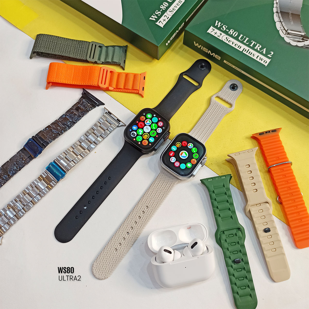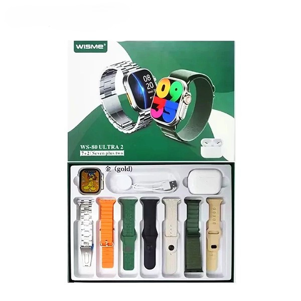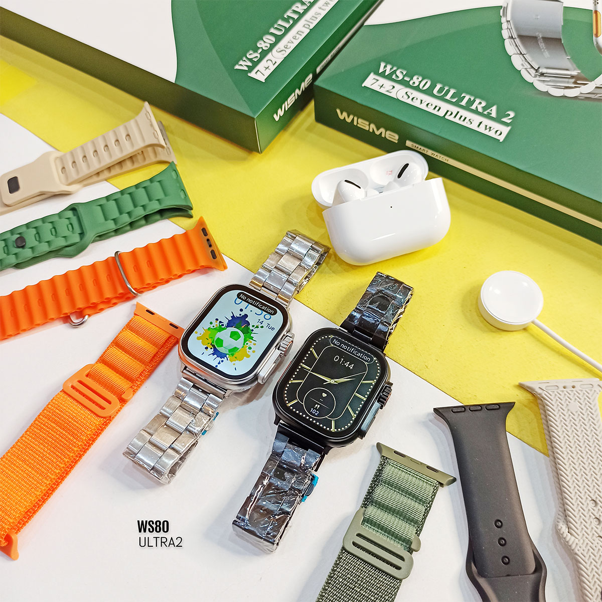 یک عدد ساعت هوشمند WS-۸۰ ULTRA ۲ یک عدد ایرپاد پرو ۷ عدد بند های مختلف یک عدد سیم شارژ وایرلس ساعت هوشمند ۱ عدد سیم شارژ ایرپاد پرو