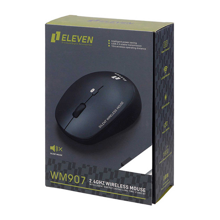 ماوس بیسیم ELEVEN مدل WM907 با طراحی زیبا و عملکرد بیصدا (Silent Mouse) گزینهای عالی برای محیطهای کاری و استفاده طولانیمدت است. این ماوس دارای ۴ کلید مقاوم با عمر بیش از دو میلیون کلیک بوده و با اسکرول لاستیکی نرم، حرکت روان و کنترل دقیقی را ارائه میدهد.